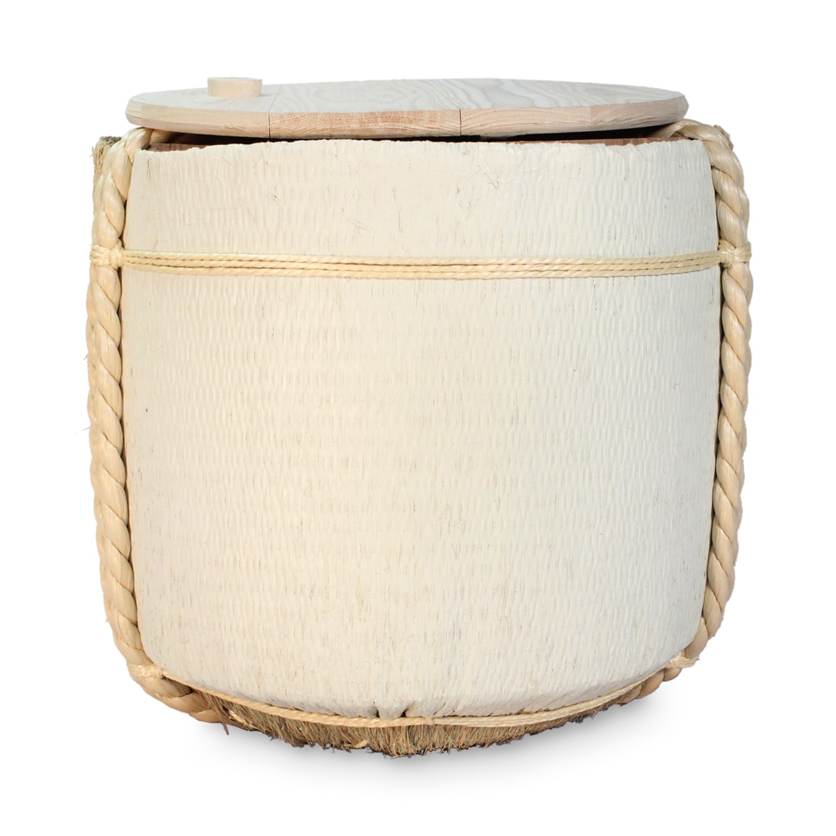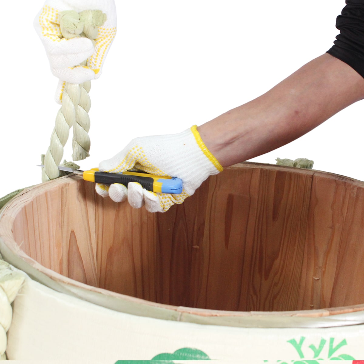 杉材と竹材で作られた樽に熟練の職人が一つひとつ手作業で丁寧に菰を巻き付け、縄で締めて作り上げています。こだわりの品質ながら、使い方は驚くほど簡単。