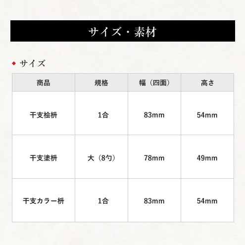 サイズは振る舞い酒にぴったりな8勺(80mm角×高さ50mm)で、振る舞い酒にちょうど良い大きさです。新年を彩るちょっと特別な演出に、干支の塗枡はいかがでしょうか。