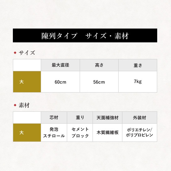 菰樽(こもだる)を飾りとしてお使いいただくことを目的とした「ディスプレイこも樽」。お店のインテリアやエクステリア、イベントでの和の演出品など、幅広いシーンでお使いいただけます。陳列タイプは天面が少し掘り下げてあり、上に商品などを置いて陳列台としてお使いいただけます。サイズは鏡開きで使われる4斗樽とほぼ同じ、直径60cm・高さ56cmとインパクト抜群の大きさです。