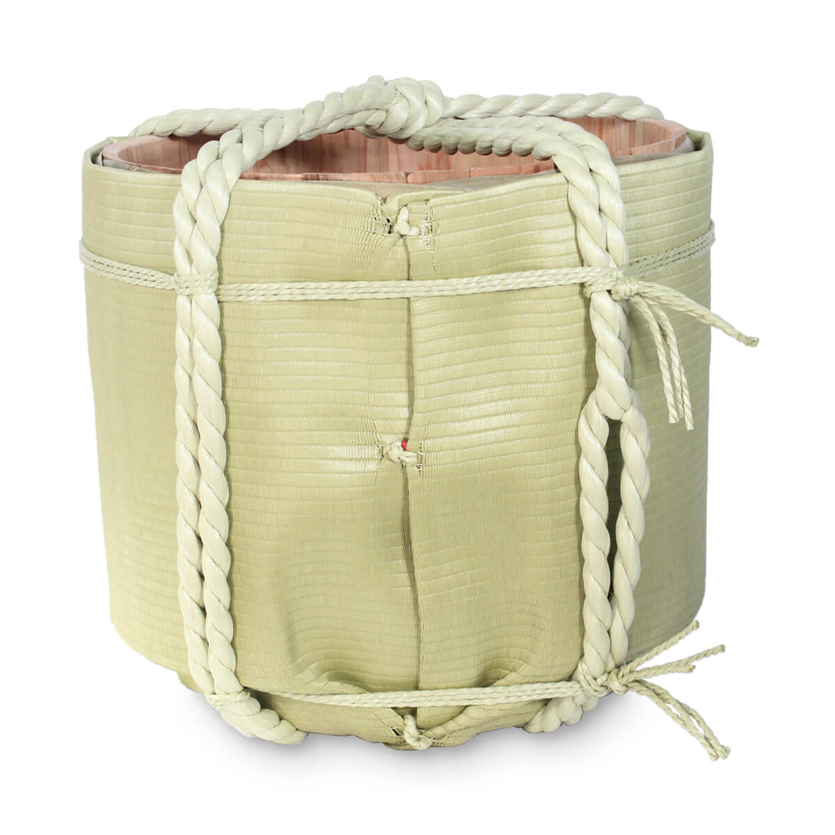 杉材と竹材で作られた樽に熟練の職人が一つひとつ手作業で丁寧に菰を巻き付け、縄で締めて作り上げています。こだわりの品質ながら、使い方は驚くほど簡単。
