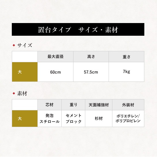鏡開き用4斗樽とほぼ同じ大きさです。天面には菰をあしらい商品などを置いて飾っていただけるようになっています。天面には杉板で補強をしておりますので、更に別の商品台を載せることが可能です。