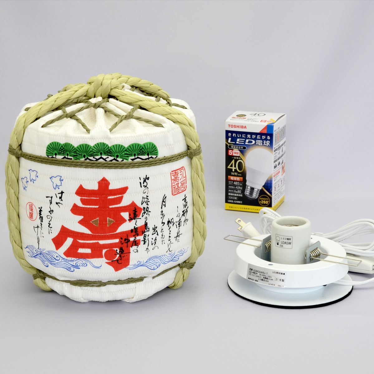 伝統的な菰樽の形をしたライトの既製品デザインは、全部で5種類。めでたい感満載の「寿 高砂や」「祝 日の出」「御来光」、春のお祝いに最適な「春風満面」やシンプルなデザインの「無印」の中から、お好みに合わせてお選びいただけます。